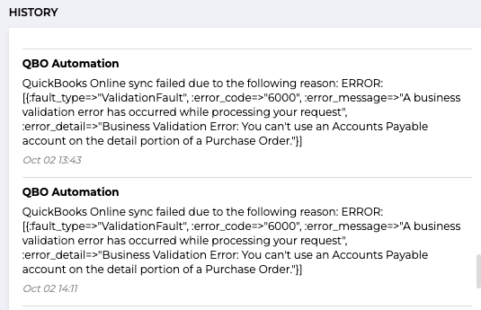 Edit the purchase order to resolve the error, and save the update. Wait a second and refresh the page to see if the purchase order has successfully synced. If not, there should be a new error message at the bottom of the history log in the history section on the purchase order.