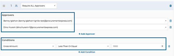- To add an approver or condition to an approval step, click on 'Add Approver' or 'Add Condition'. To remove, click on the dustin icon to the right of each.