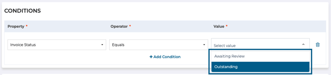 Invoices can require either a one or two stage approval process depending on how the invoice was uploaded. In the conditions section on an invoice approval flow, select "Invoice Status" in the property field to see the two possible statuses.