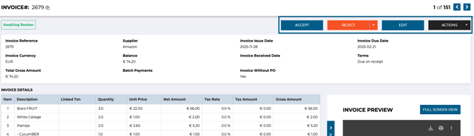 At this stage, you can 'Accept' to confirm the legitimacy of the invoice's source. Review and verify the accuracy of the data extracted from the OCR scan, and match the invoice to a purchase order on your account if it was not matched automatically.