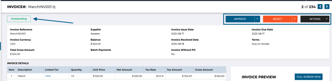 Approval of an invoice in the "Outstanding" status moves it forward for payment processing.